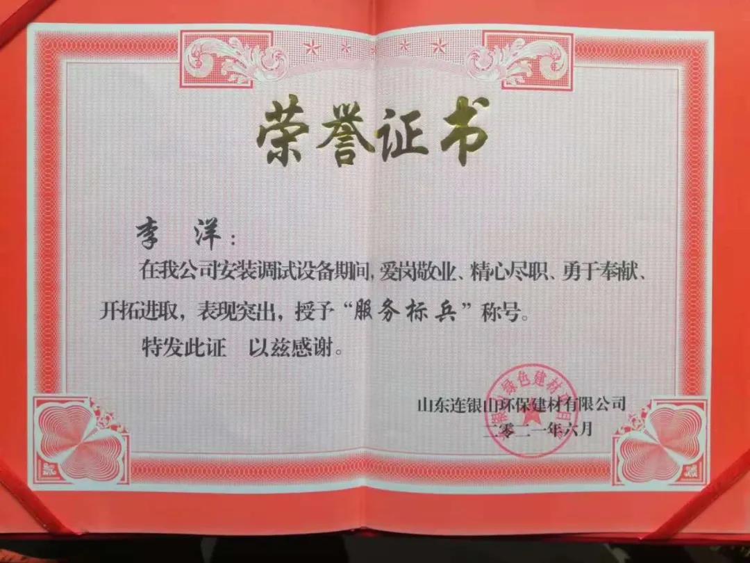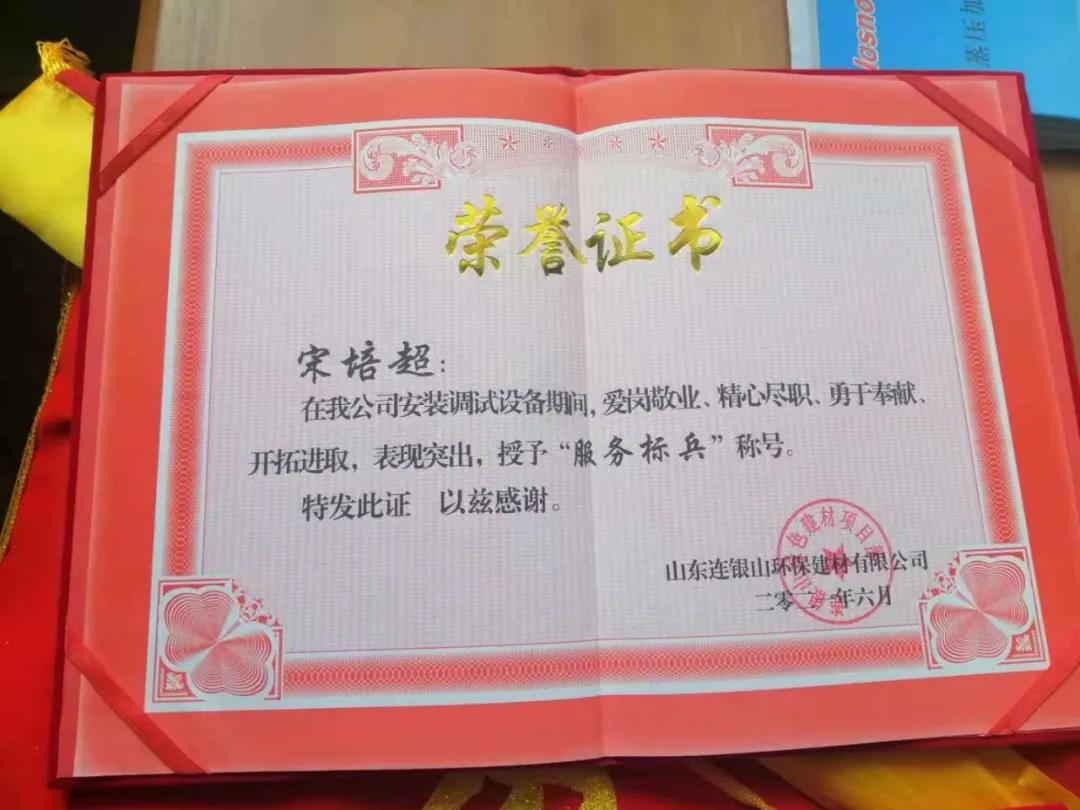 炎炎夏日,天意機(jī)械在向客戶山東連銀山環(huán)保建材有限公司售出保溫裝飾一體化板生產(chǎn)線之后,隨即派出售后團(tuán)隊(duì)對(duì)設(shè)備進(jìn)行安裝調(diào)試及售后培訓(xùn)。售后團(tuán)隊(duì)不畏酷暑,精心、耐心、專(zhuān)業(yè)地為客戶進(jìn)行安裝調(diào)試,贏得了客戶的好評(píng)和認(rèn)可,客戶為表達(dá)謝意,特授予天意機(jī)械售后人員榮譽(yù)證書(shū)和錦旗,以表彰售后人員愛(ài)崗敬業(yè)、精心盡職、勇于奉獻(xiàn)、開(kāi)拓進(jìn)取的精神。