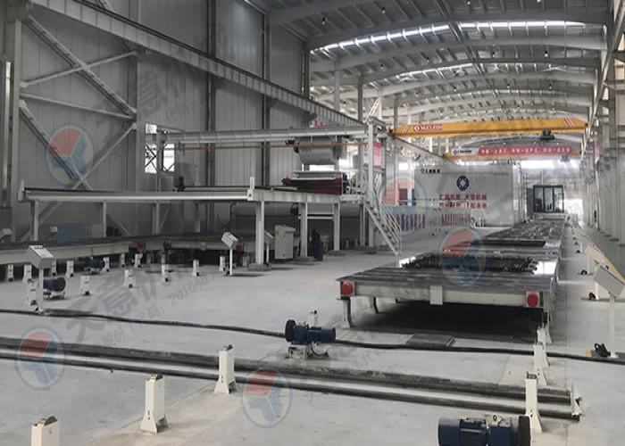 PC環(huán)形疊合板生產(chǎn)線采用高精度、高結(jié)構(gòu)強(qiáng)度的成型模具,經(jīng)自動(dòng)布料機(jī)把混凝土澆筑其中、振動(dòng)臺(tái)振搗后并不立即脫模,而是經(jīng)預(yù)養(yǎng)護(hù)、蒸汽養(yǎng)護(hù),使構(gòu)件強(qiáng)度滿足設(shè)計(jì)強(qiáng)度時(shí)才進(jìn)行拆模處理,拆模后的成品構(gòu)件運(yùn)輸至成品暫存區(qū)或室外堆場,而空模臺(tái)沿輸送線自動(dòng)返回,形成自動(dòng)化環(huán)形流水作業(yè)。